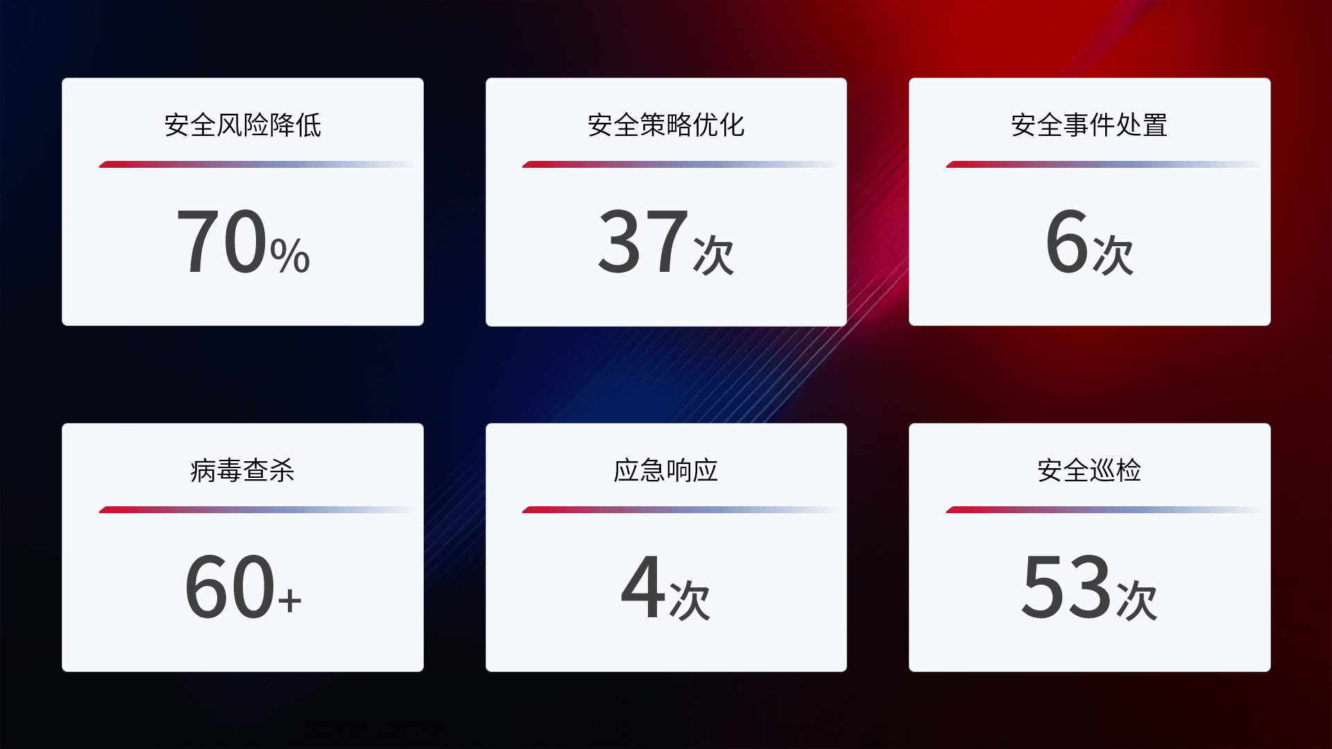 提供全面的安全事件报告体系,,,包括处置报告、、周报、、、、季度和年度总结,,结合持续监控,,,,帮助客户深入了解网络安全状况。。。