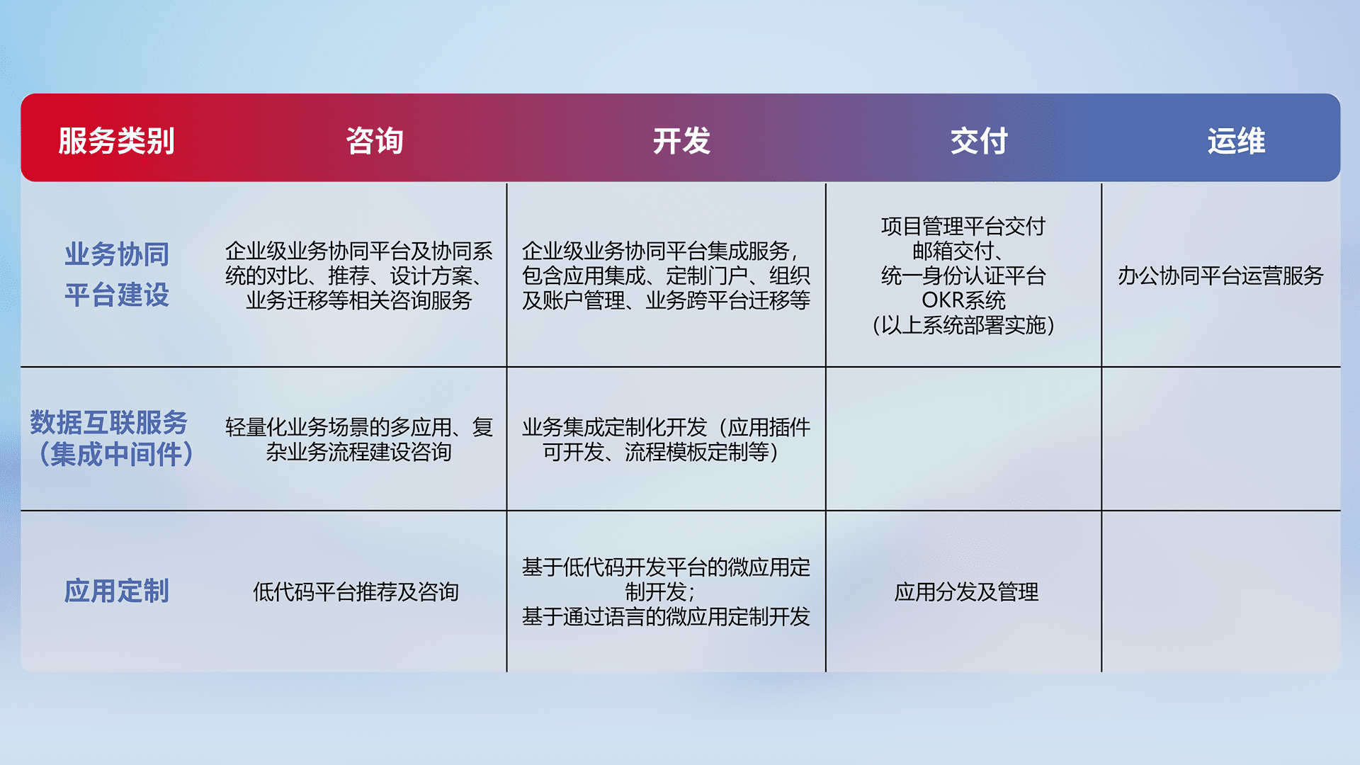 针对钉钉、、企微、、IDaas等平台级产品提供产品的规划、、、、方案、、、、交付、、、定制化开发等服务,,,实现如统一协同办公、、智能客户服务、、、混合会议管理、、智能数据查询、、、等业务场景,,,实现数字化转型。。