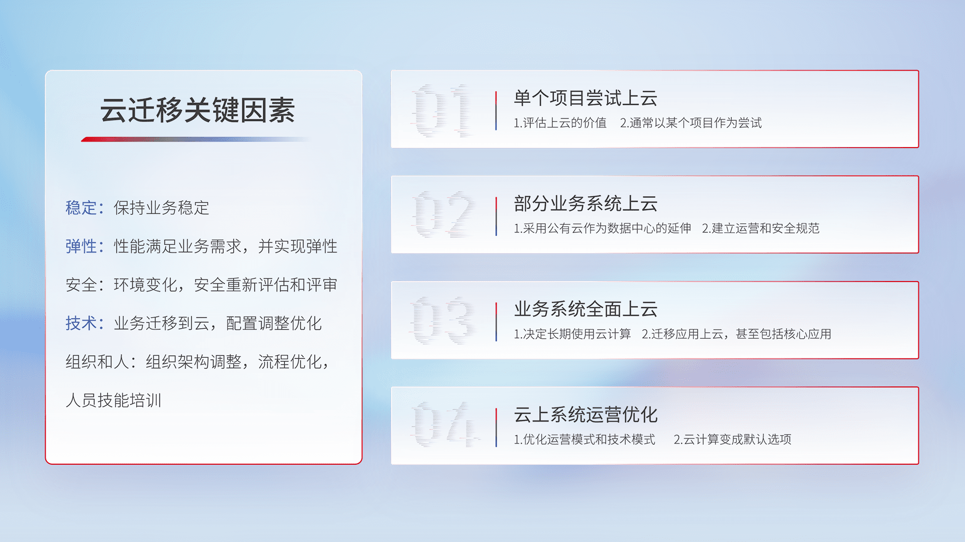 结合实际业务,,,从规划设计、、、云平台选型、、、云原生改造、、、、数据迁移、、、集成交付,,,,迁移全过程为客户识别最佳上云路径,,,,做好风险识别管理,,,,设计网络架构、、、身份权限、、、安全审计合规、、操作审计、、、日志审计、、、、监控告警策略、、、多站点容灾设计等,,对云上基础设施进行整体规划,,,提升IT治理水平,,,以满足弹性、、高可用、、高性能的需求。。。。